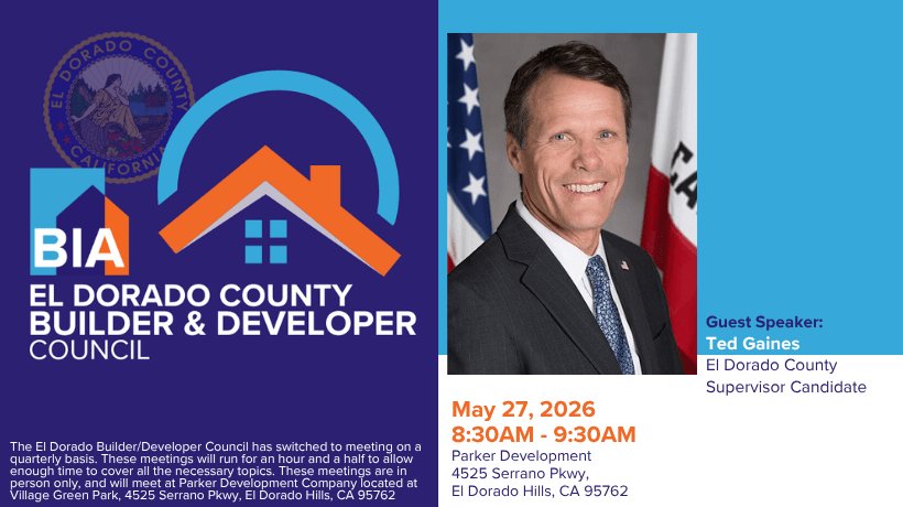 The El Dorado Builder/Developer Council has switched to meeting on a quarterly basis. These meetings will run for an hour and a half to allow enough time to cover all the necessary topics. These meetings are in person only, and will meet at Parker Development Company located at Village Green Park, 4525 Serrano Pkwy, El Dorado Hills, CA 95762